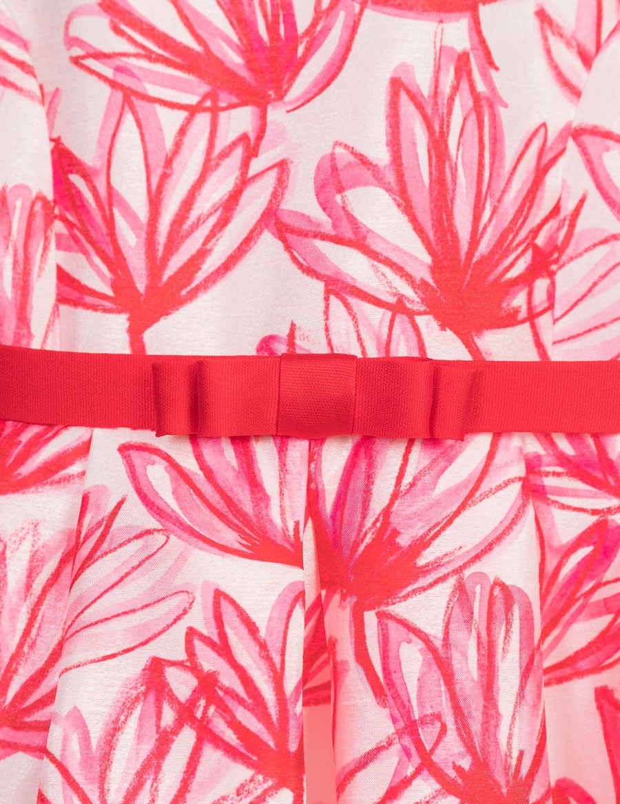 Stylowa sukienka z nadrukiem w kwiaty z podszewką i warstwą tiulu dla większej objętości. Pasek z wiązaniem. Dół z marszczeniami i zakładkami dodającymi objętości. Otwarte plecy i zapięcie na guziki. Wzór bardzo wyszukany i elegancki.