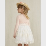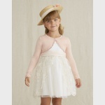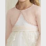 Urocze trykotowe bolerko z gładkiej dzianiny z falowanym wykończeniem. Zapięcie na pojedynczy guzik przy szyi. Niebanalny design, który będzie idealnym uzupełnieniem każdej stylizacji.