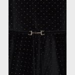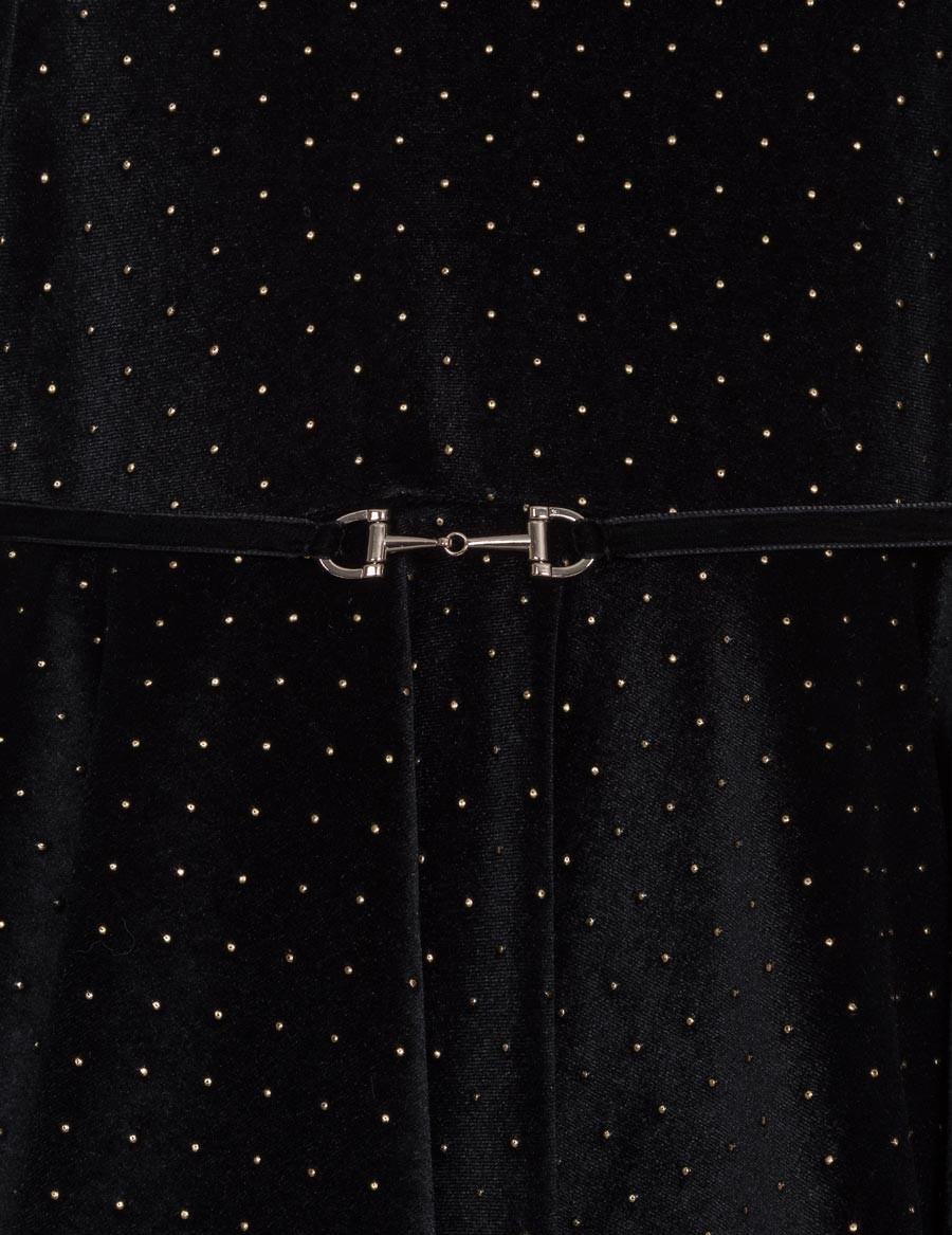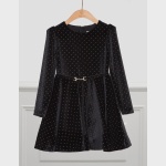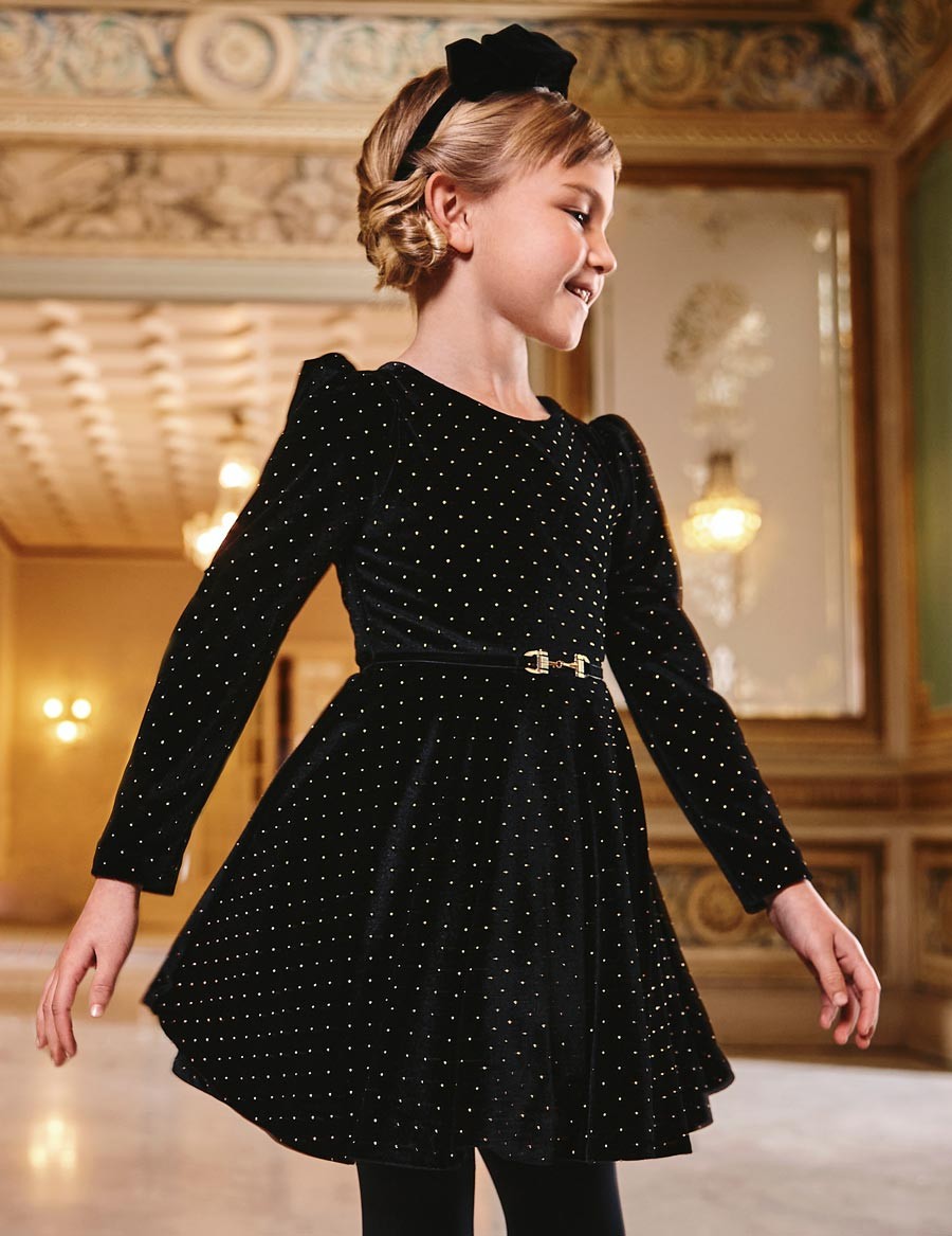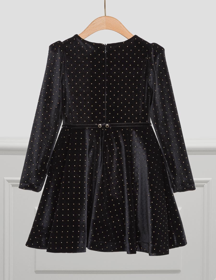 Piękna aksamitna sukienka z ćwiekami. Posiada podszewkę i warstwę tiulu dla większej objętości. Długi rękaw z zakładkami na ramionach nadającymi ubranku wyszukanego charakteru. W pasie aksamitna wstążka. Idealna na wyjątkowe okazje.