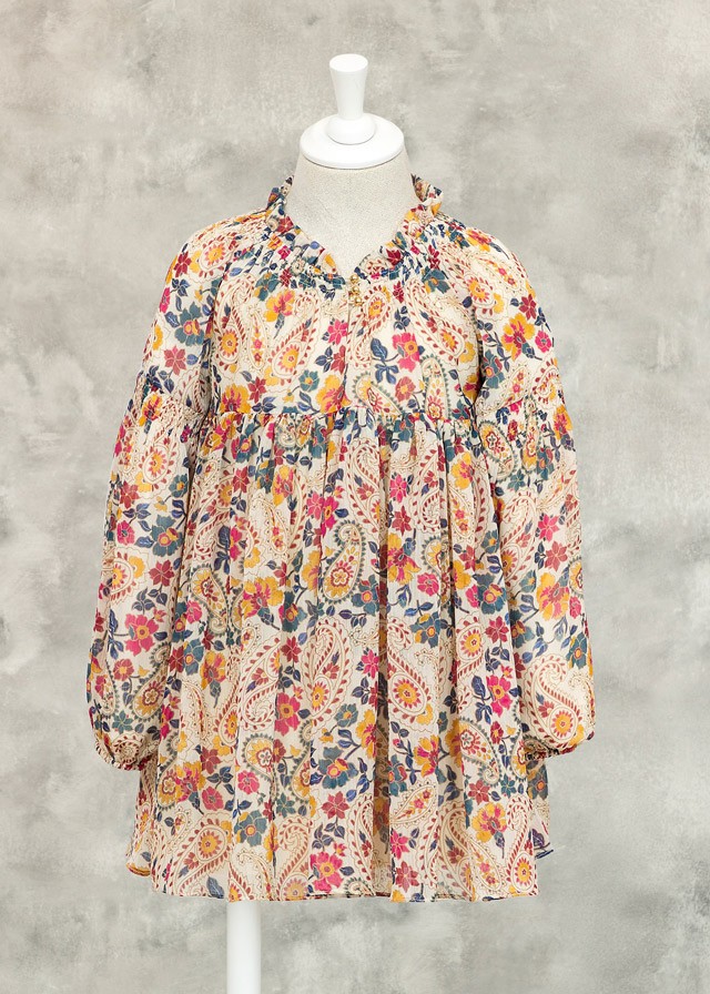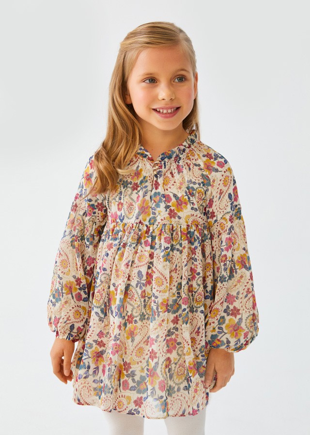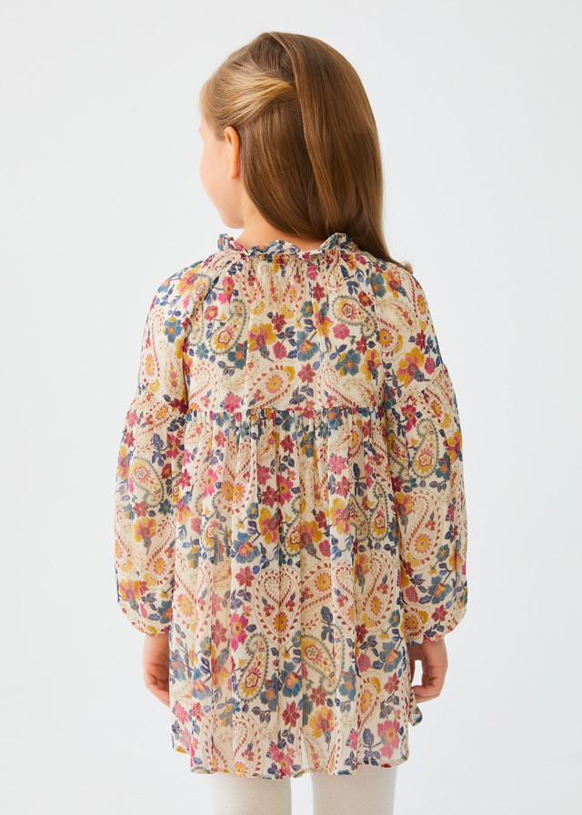 Sukienka z kwiatowym nadrukiem i długim rękawem z elastyczną gumką przy mankietach.