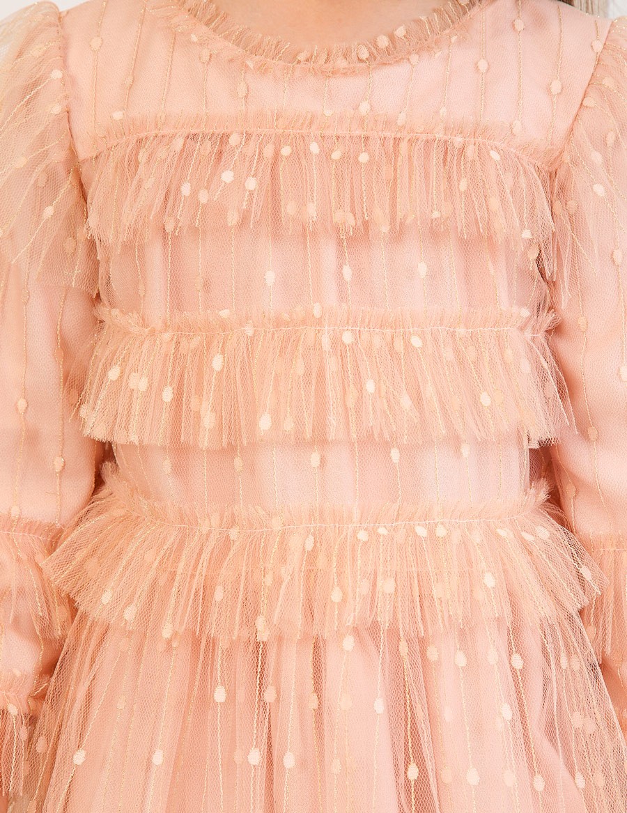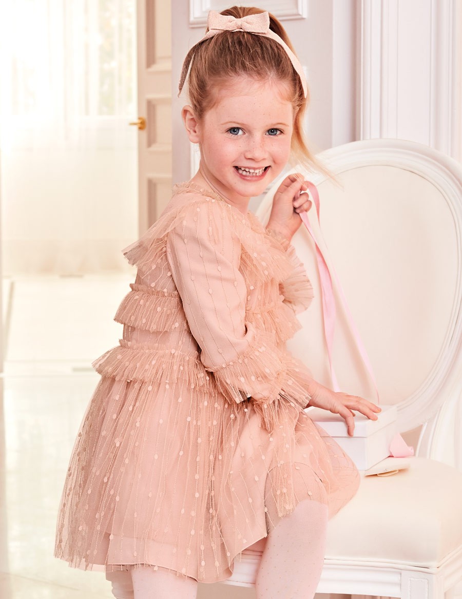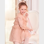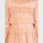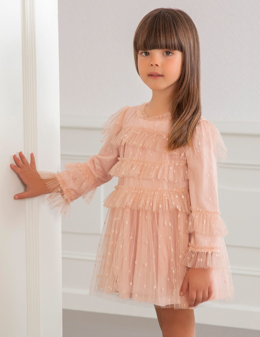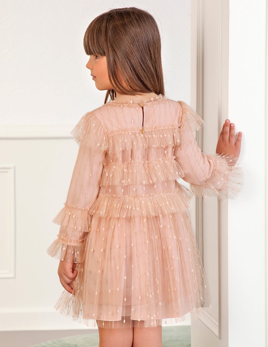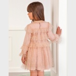 Delikatna i wyszukana sukienka tiulowa z wykończeniem z nici lureksowej. Długie rękawy z falbankami na ramionach i mankietach. Góra z falbankami. Tylne zapięcie na guziki. Idealny model na specjalne okazje jak i na co dzień.