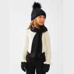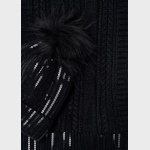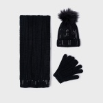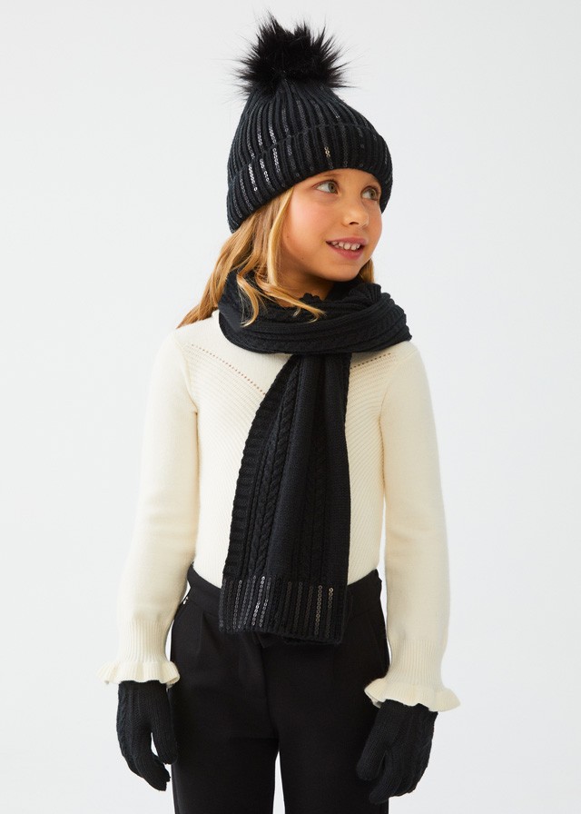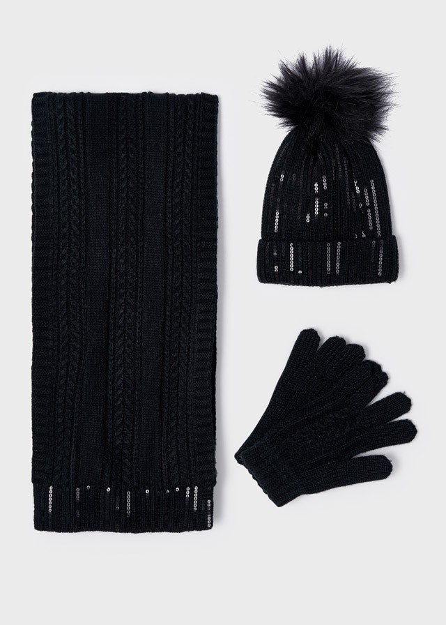 Komplet czapka-szalik-rękawiczki z cekinami i plecionymi detalami.