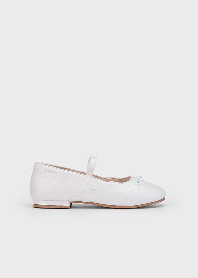 SKU: 25-45619-068 Kategorii: MARKI, Baleriny, Dziewczynka, Mayoral, OBUWIE Znaczniki: gumka nad stopą, kwiatowa aplikacja, połyskująca biel
