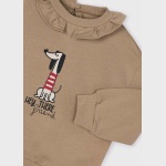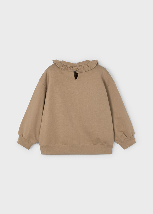 Bluza dla dziewczynki z okrągłym dekoltem wykończonym uroczą falbanką. Dół i mankiety z elastycznej dzianiny zapewniają wygodne dopasowanie. Ozdobiona subtelnym haftem, który dodaje jej dziewczęcego uroku.