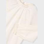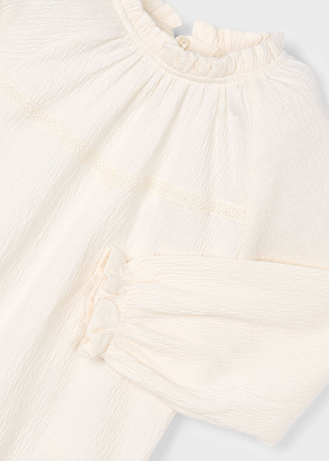 Model został ozdobiony uroczą falbanką przy mankietach, która dodaje mu romantycznego, dziewczęcego wdzięku. Marszczenia na materiale tworzą subtelną objętość, podkreślając lekkość fasonu i nadając mu elegancki wygląd.