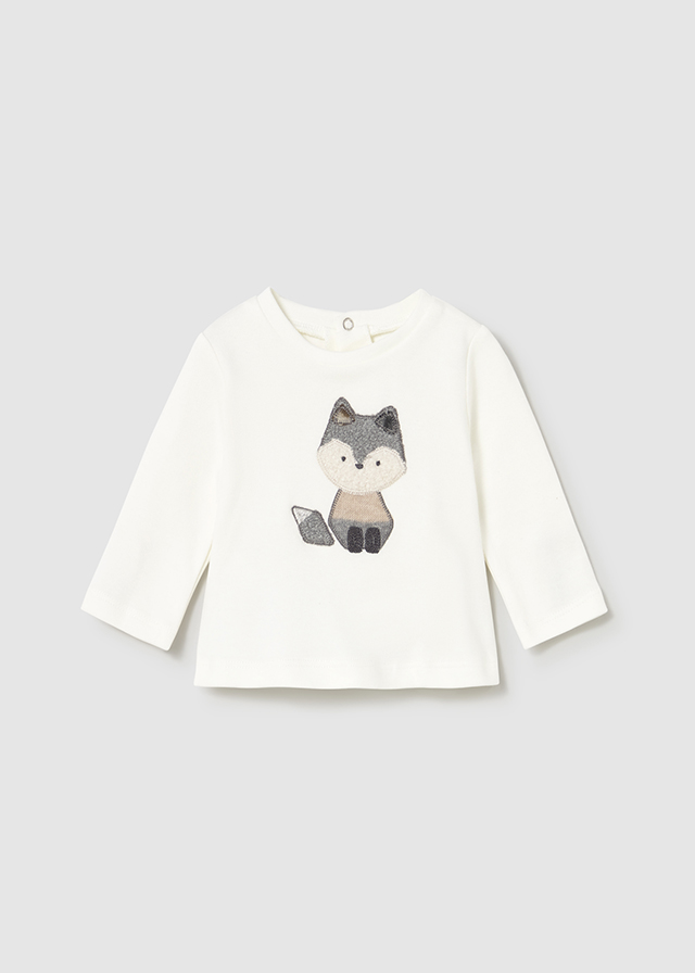 Koszulka posiada klasyczny, okrągły dekolt oraz praktyczne zapięcie na zatrzaski umieszczone na plecach. Całość zdobi subtelna aplikacja i nadruk wykonany techniką sitodruku.
