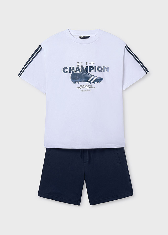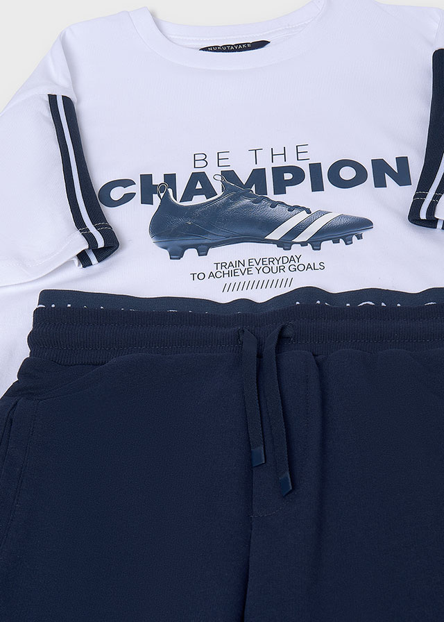 Komplet dla chłopca składający się z koszulki i krótkich spodenek z motywem piłkarskim.