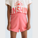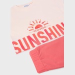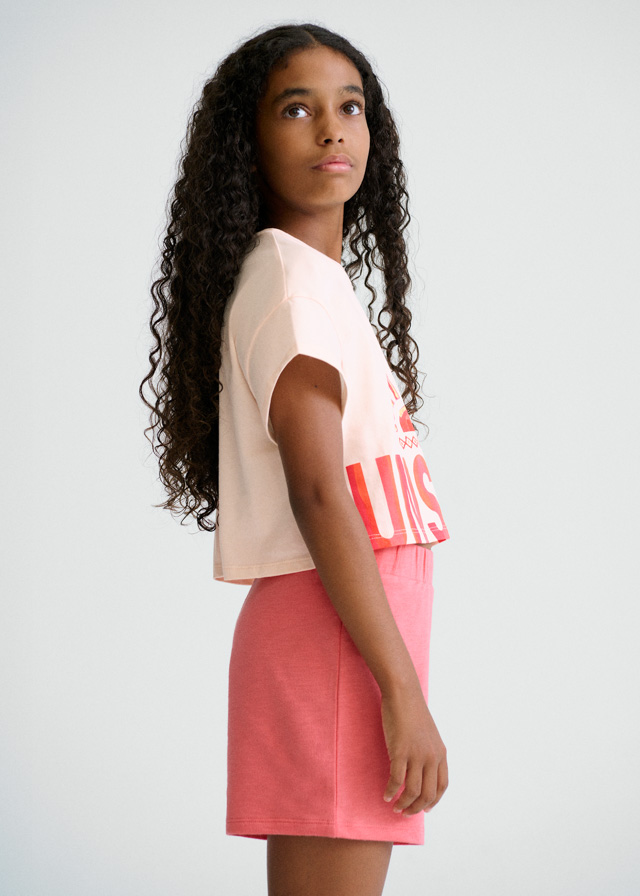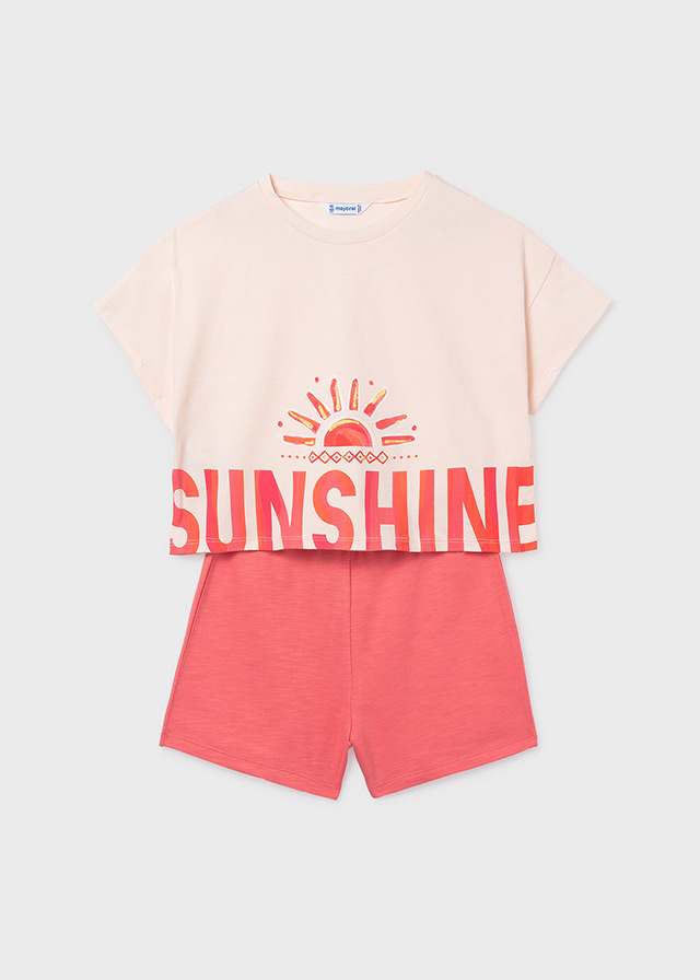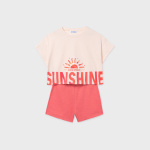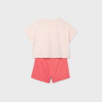 Komplet dla dziewczynki składający się z różowych krótkich spodenek i białej koszulki z motywem.