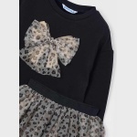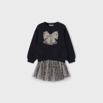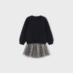 Bluza dla dziewczynki. Na dole wykończona skrzyżowanym przeszyciem materiału. Ozdobny motyw z przodu. Okrągły dekolt. Połączenie różnych materiałów w celu uzyskania unikalnego i wyjątkowego projektu.