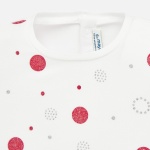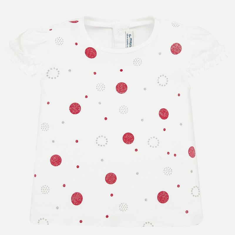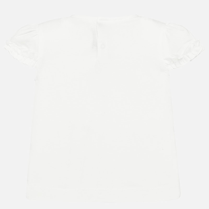 Koszulka z krótkim rękawem dla dziewczynki Baby. Okrągły dekolt. Zapięcie na małe zatrzaski na plecach, które ułatwiają założenie ubranka. Delikatna i elastyczna bawełna. Model z marszczeniami i z falbankami. Ozdoby: glitter. Projekt z nadrukiem.