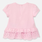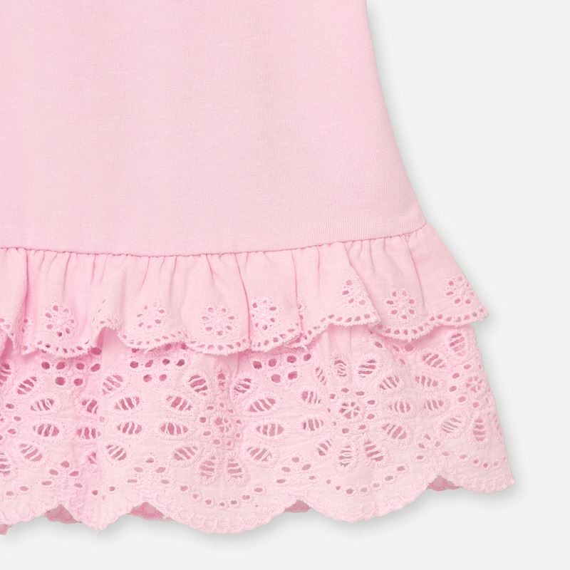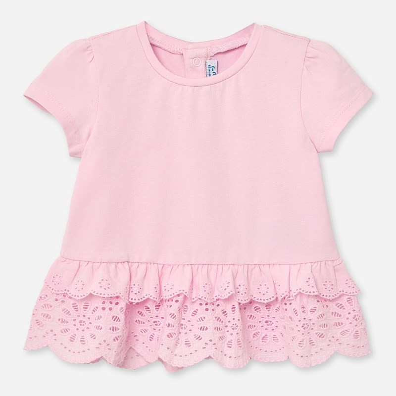 Koszulka Mayoral z krótkim rękawem dla dziewczynki Baby. Okrągły dekolt. Zapięcie na małe zatrzaski na plecach, które ułatwiają założenie ubranka. Delikatna i elastyczna bawełna. Model z marszczeniami. Ozdoby: elementy ażurowe.