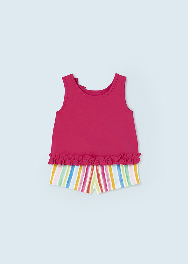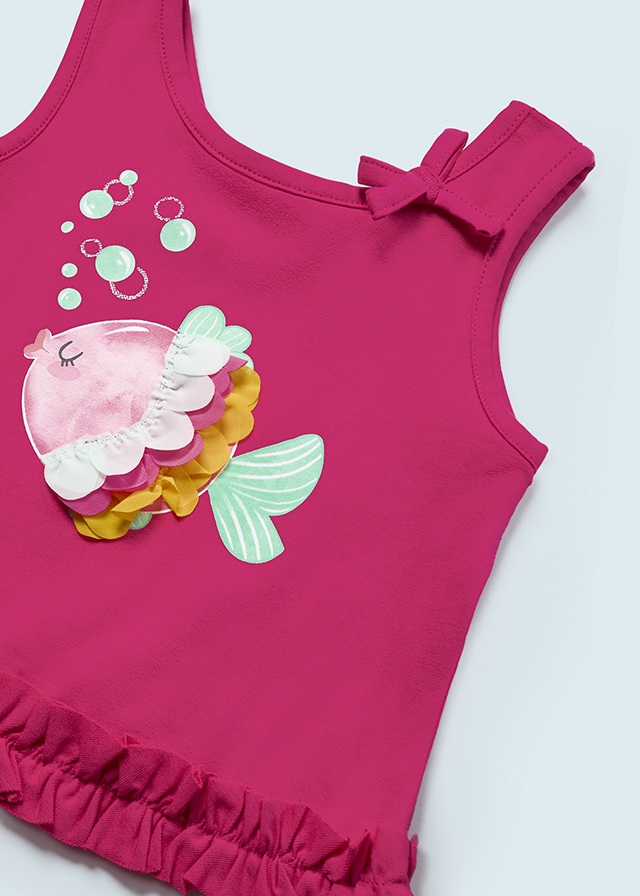 Koszulka na ramiączkach. Ozdoby: ozdobna aplikacja, aplikacja w postaci kokardki. Projekt z nadrukiem.