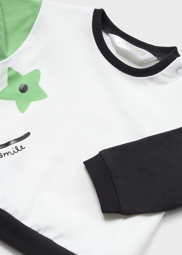 Zapięcie na małe zatrzaski na ramieniu, które ułatwiają założenie ubranka. Ozdoby: ozdobne grafiki.