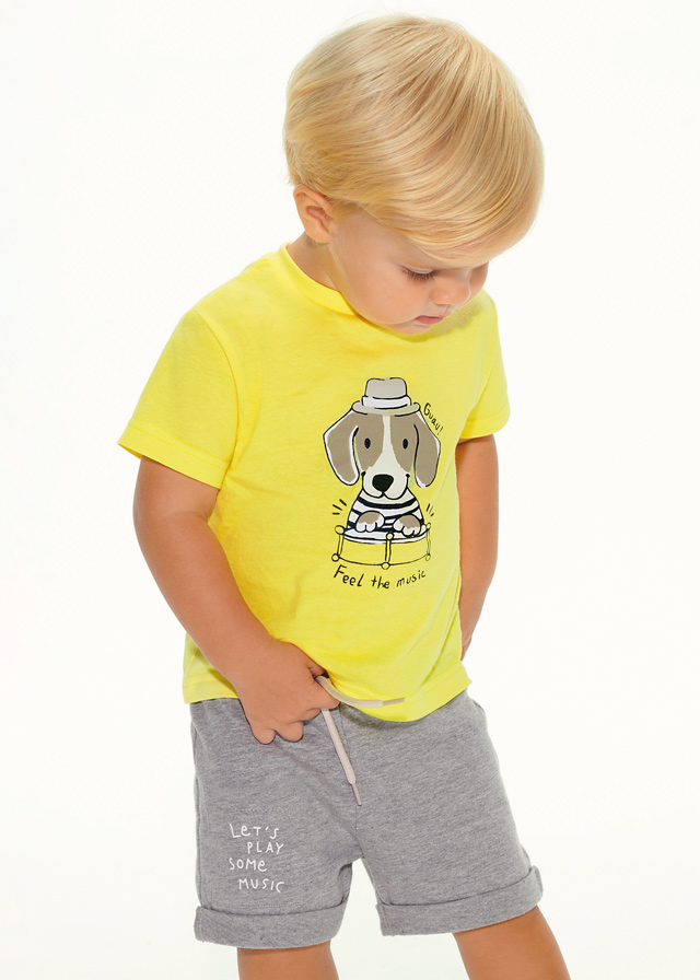 Komplet trzech ubranek dla chłopca, składający się z dwóch koszulek i dobranych krótkich spodni.