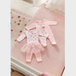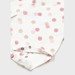 Body z długim rękawem dla noworodka z falbankami na ramionach. Okrągły dekolt. Zapięcie na małe zatrzaski na plecach i w kroku, które ułatwiają założenie ubranka.