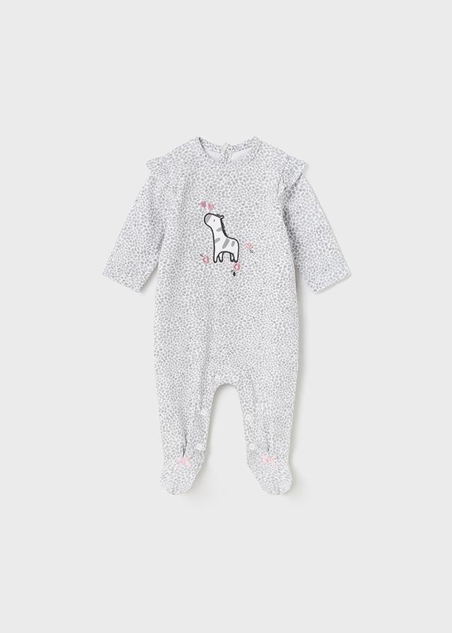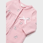 Śpioszki z długim rękawem. Zapięcie na zatrzaski z przodu. Zapięcie na zatrzaski w kroku ułatwiające zakładanie.