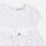 Sukienka z krótkim rękawem dla dziewczynki Newborn. Okrągły dekolt. Model dopasowany w pasie. Zapięcie na plecach z ukrytym suwakiem. Elegancka i połyskująca tkanina satynowa. Model z marszczeniami. Ozdoby: ozdobna tasiemka, aplikacja w postaci kokardki. Projekt z nadrukiem. Model ten należy do naszej bardziej eleganckiej i wyjątkowej linii zaprojektowanej dla najmniejszych na specjalne okazje.