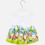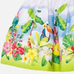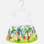 Sukienka na ramiączkach dla dziewczynki Baby. Model z łódeczkowym dekoltem. Zapięcie na jeden guzik i niewidoczny suwak na plecach. Delikatna i elastyczna bawełna. Model z marszczeniami i z falbankami. Nadruk z motywami tropikalnymi.