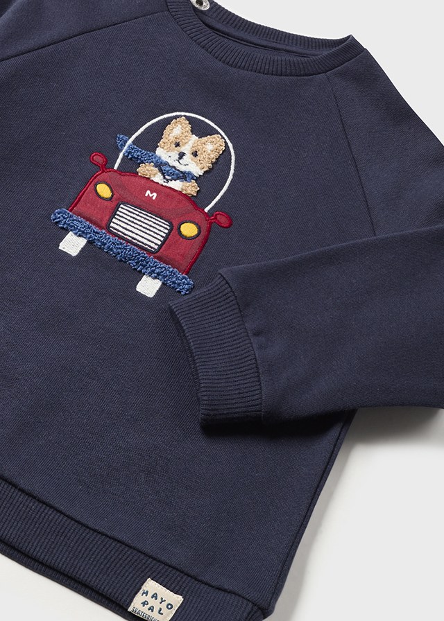 Z przodu urocza, haftowana aplikacja przedstawiająca psa w samochodzie.