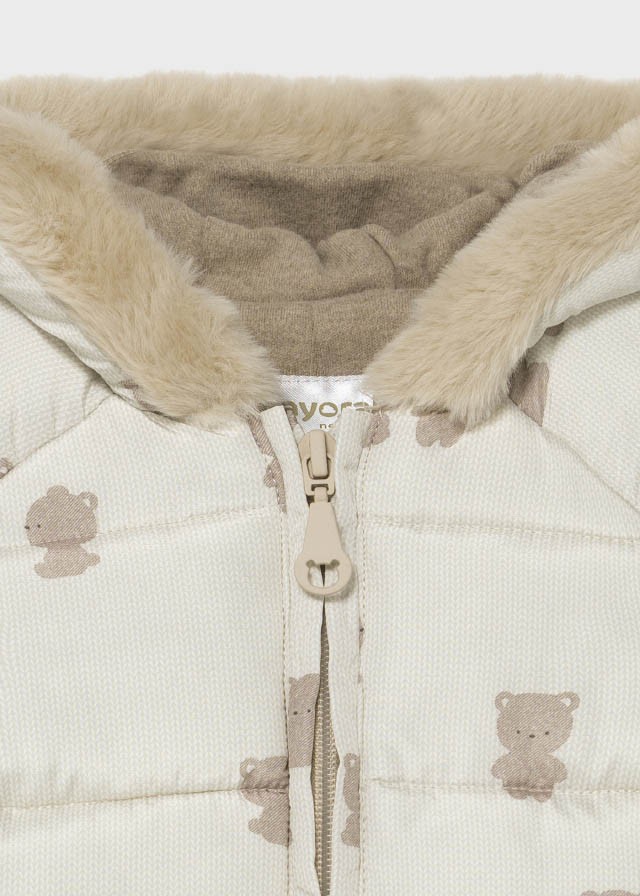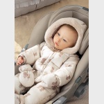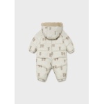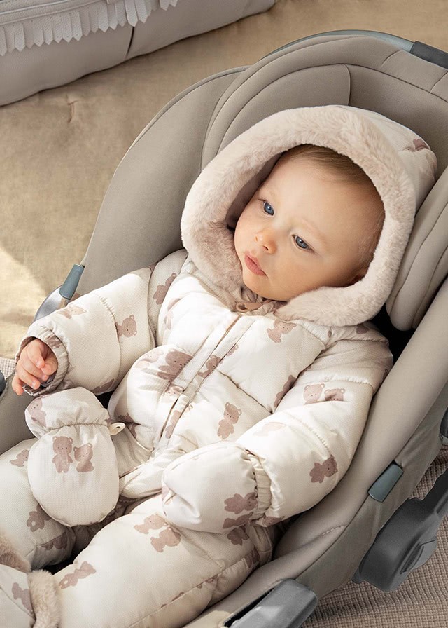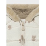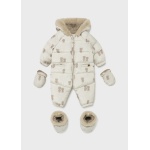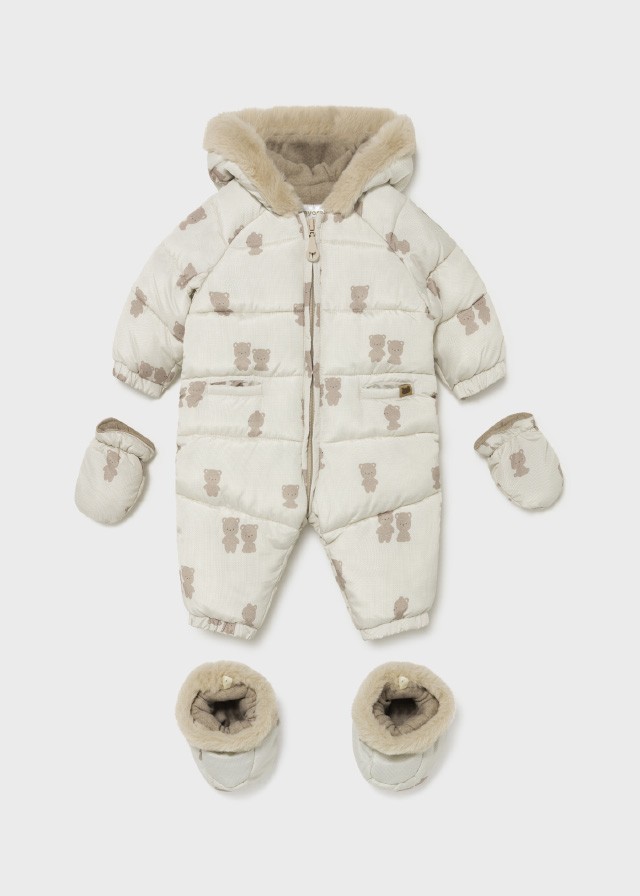 Kombinezon z długim rękawem dla noworodka dziewczynki 0 do 18 miesięcy. Kołnierz z kapturem. Kaptur z futerkowym wykończeniem. Zapięcie na środku na zamek błyskawiczny. Model z odpinanymi rękawiczkami. Projekt z nadrukiem.