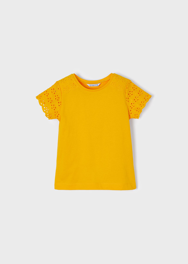 Krótkie, ażurowe rękawki dodające koszulce oryginalności i uroku.
