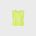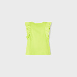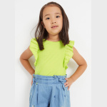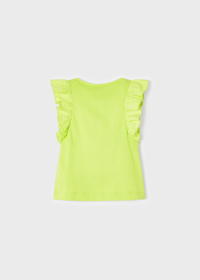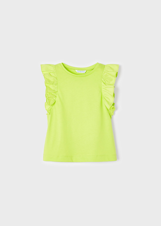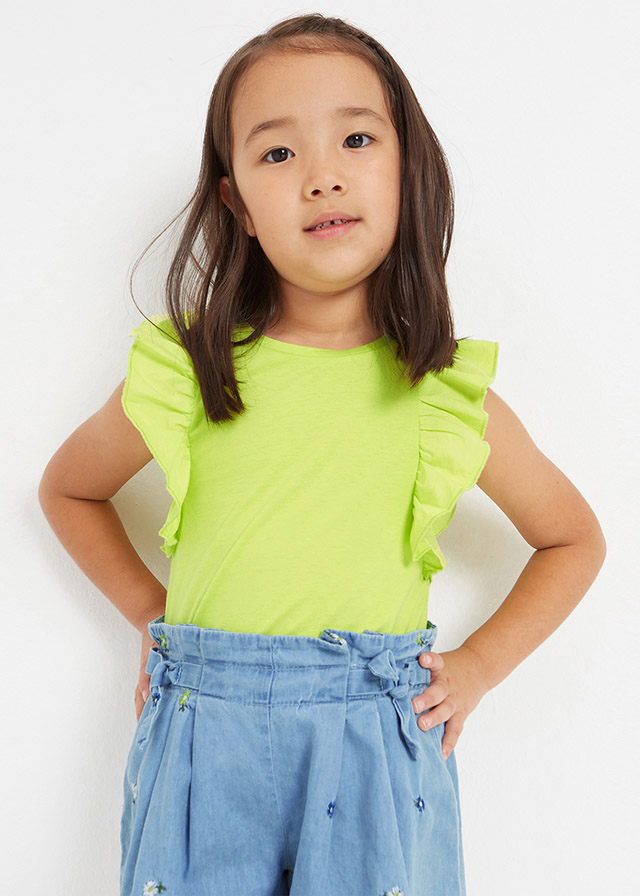 Bluzka jest ozdobiona falbankami, dzięki którym prosty model zmienia się w ciekawą propozycję.