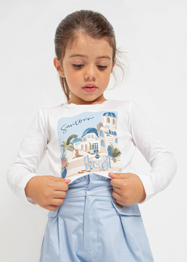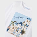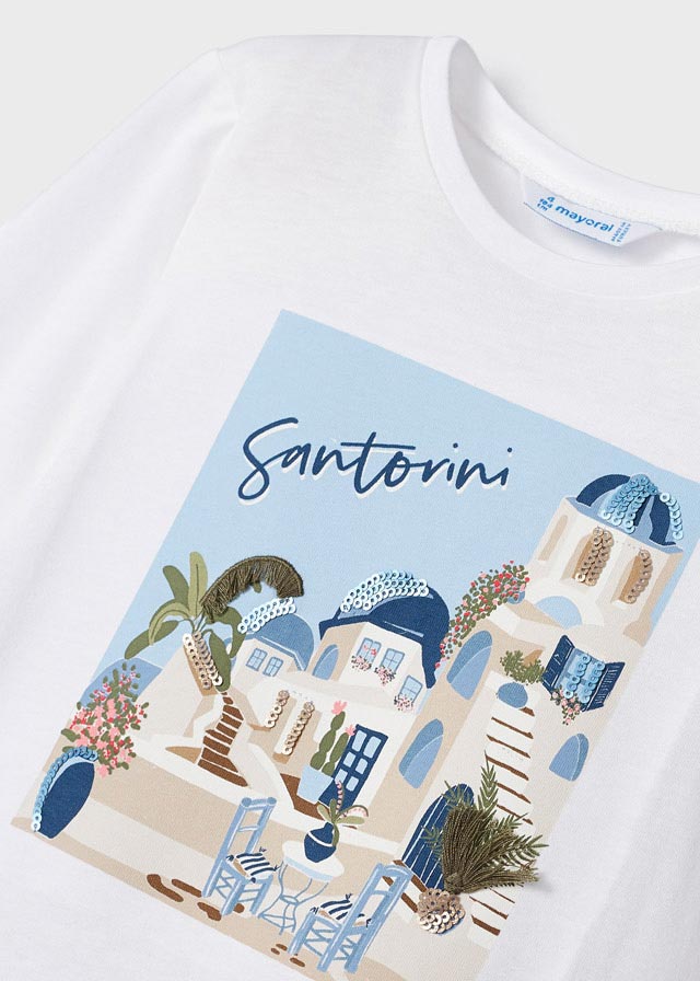 Z przodu nadruk dla małych fanek podróży, przedstawiający grecką wyspę Santorini.