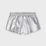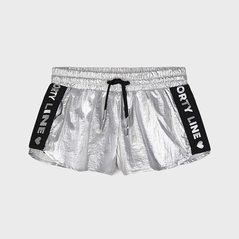 Modne szorty Mayoral dla dziewczynki, metalizowane, z bocznymi lampasami w kontrastowym kolorze. Szorty na gumce w pasie, z bocznymi kieszonkami.