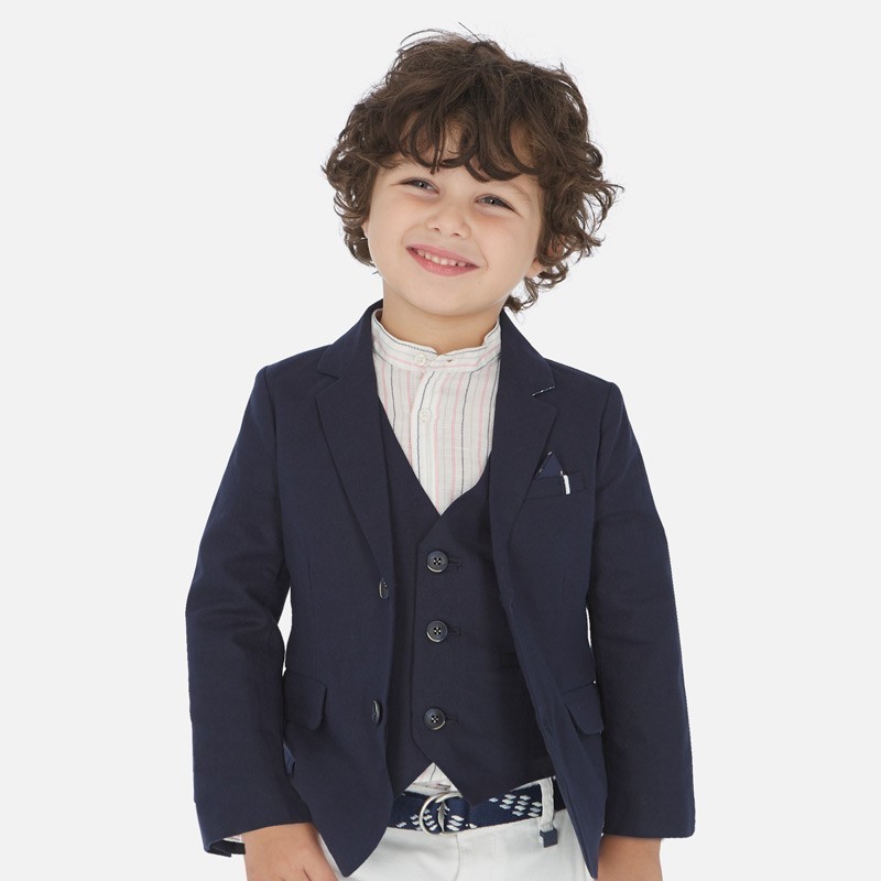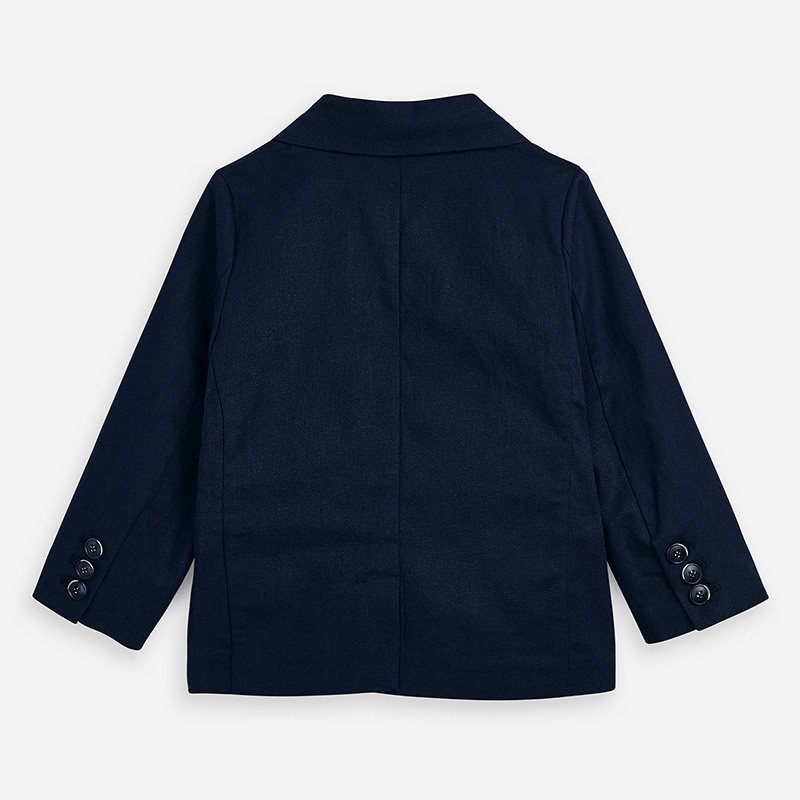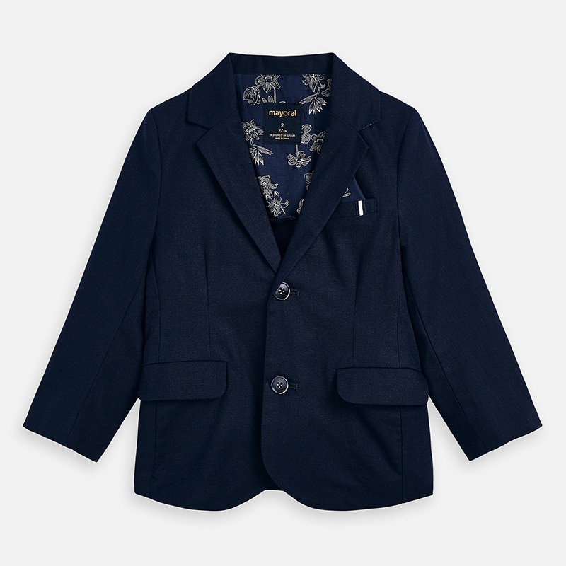 Marynarka dla chłopca z mankietem zapinanym na guziki. Kołnierzyk z klapami. Zapięcie z przodu na guziki. Lekki i modny materiał z domieszką lnu. Wewnętrzna podszewka we wzory. Z przodu funkcjonalne kieszenie.