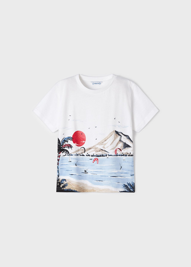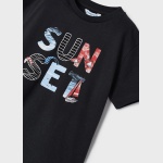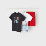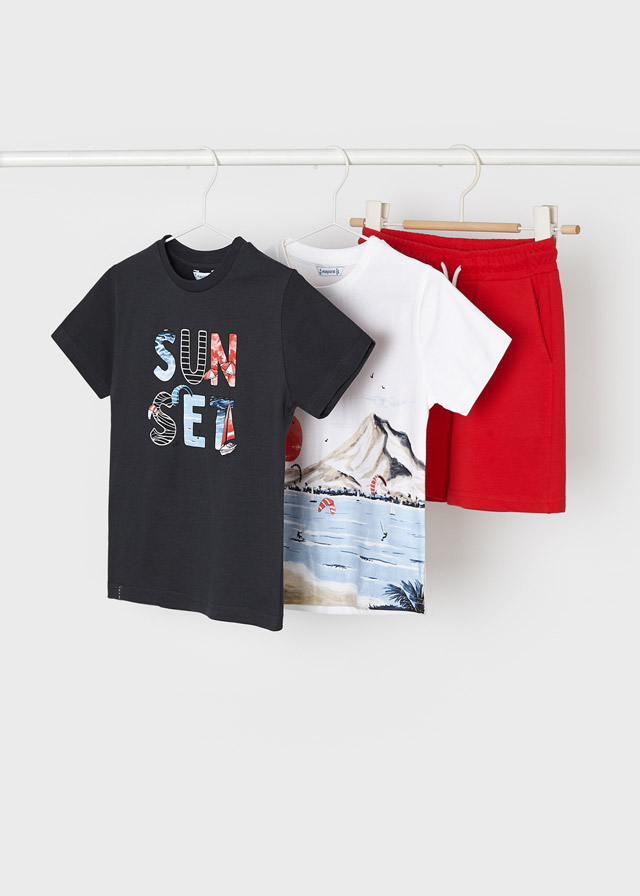 Komplet trzech ubranek dla chłopca, składający się z dwóch koszulek i dobranych krótkich spodni.