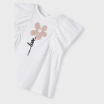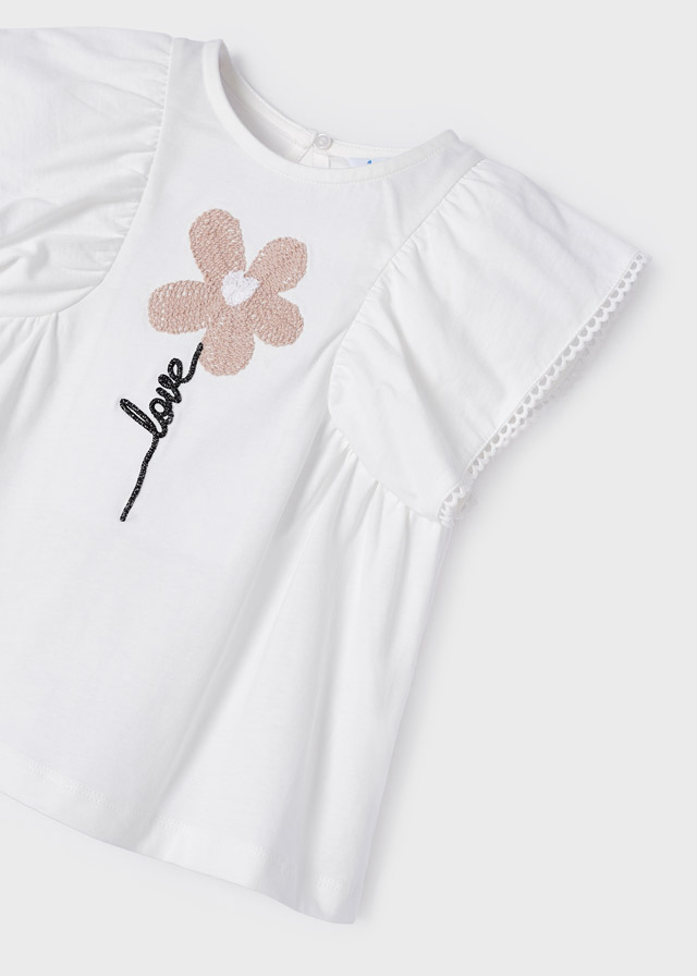 Koszulka z krótkim rękawem z detalami z falbany dla dziewczynki. Okrągły dekolt. Projekt z nadrukiem.