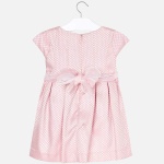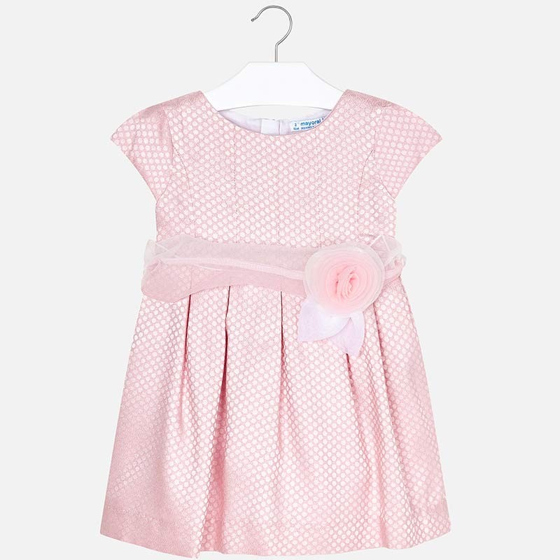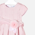 Sukienka z krótkim rękawem dla dziewczynki. Okrągły dekolt. Model dopasowany w pasie. Zapięcie na plecach z ukrytym suwakiem. Oryginalny materiał strukturalny w groszki. Model z marszczeniami i wewnętrzną podszewką. Elegancki zdejmowany pasek z zapięciem. Ozdoby: kwiatowa aplikacja. Model ten należy do naszej bardziej eleganckiej i wyjątkowej linii, zaprojektowanej dla najmniejszych na specjalne okazje.