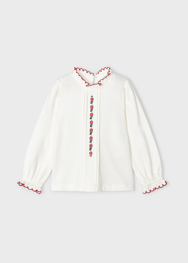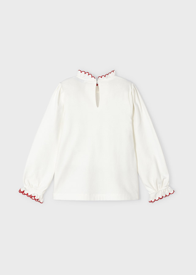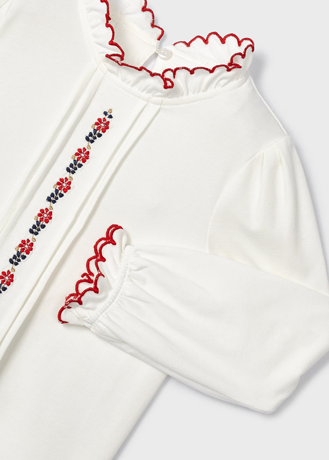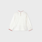 Długie rękawy zakończone ściągaczem i również ozdobione granatowym obszyciem.