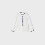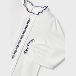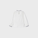 Długie rękawy zakończone ściągaczem i również ozdobione granatowym obszyciem.