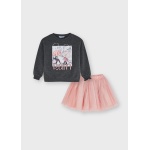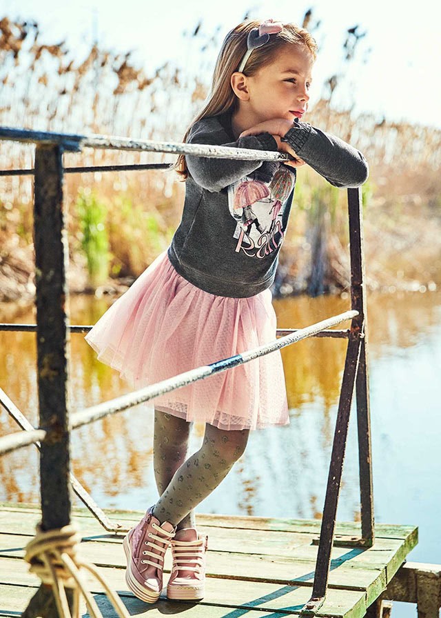 Okrągły dekolt. Dół z elastyczną gumką dla lepszego dopasowania. Krótka spódniczka dla dziewczynki. Elastyczna gumka w pasie dla lepszego dopasowania. Artykuł wykonany z lekkiego i zwiewnego tiulu. Model z wewnętrzną podszewką