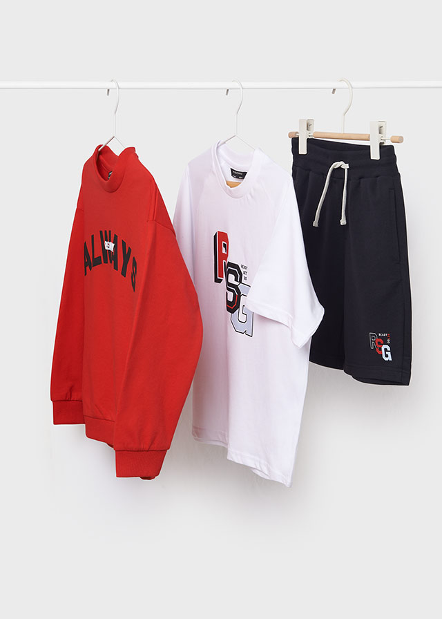 Dres dla chłopca składający się z trzech elementów: bluzy, długich sportowych spodni i pasującej koszulki.