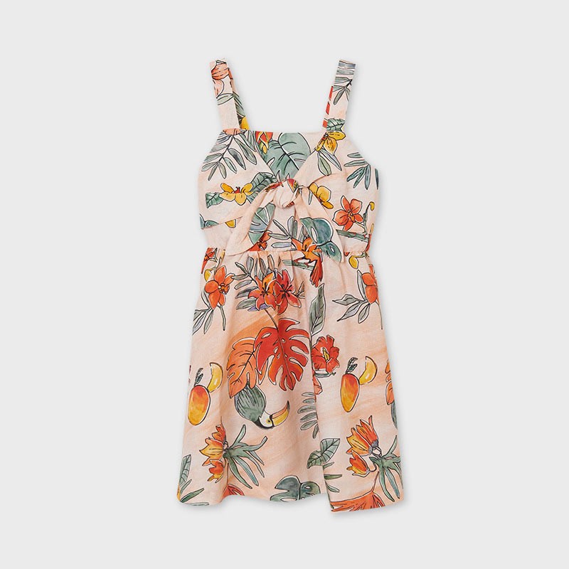 Sukienka na szerokich ramiączkach dla dziewczyny. Okrągły dekolt. Model dopasowany w pasie. Zapięcie na guziki na plecach dla łatwiejszego zakładania ubranka. Zapięcie na plecach z ukrytym suwakiem. Wygodna tkanina popelinowa, charakteryzująca się trwałością i łatwością utrzymania. Model z marszczeniami. Nadruk w groszki.