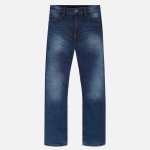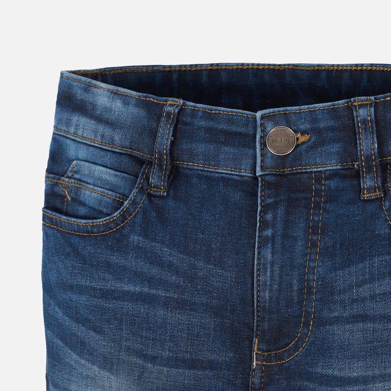 Spodnie przylegające do ciała, dla których typowa jest bardziej dopasowana linia (Super slim). Pas z regulowaną gumą i zapięciem na suwak i guzik. Nowoczesna tkanina jeansowa z efektem sprania i użytkowania. Model z wieloma kieszeniami.