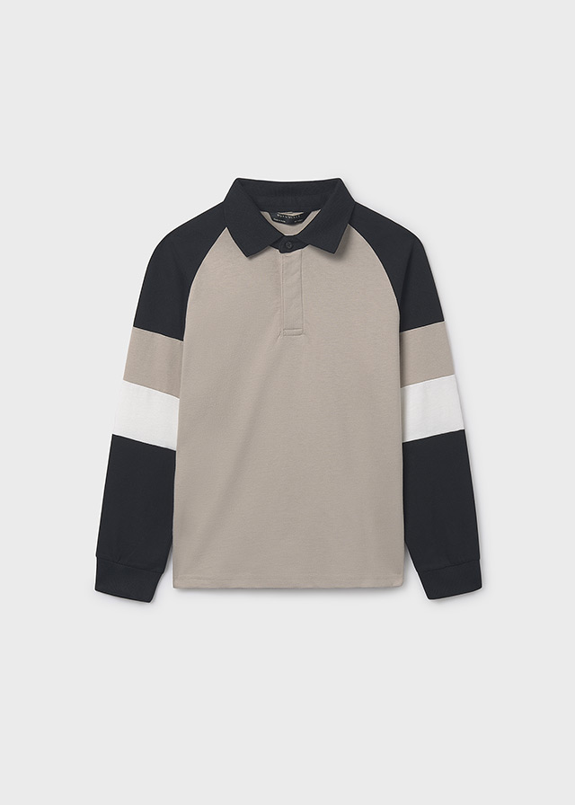Model ma klasyczny kołnierzyk polo i zapięcie na guziczki pod szyją, dzięki czemu łączy sportową wygodę z eleganckim wyglądem. Detale w kontrastowych kolorach.