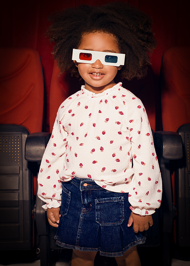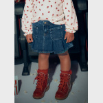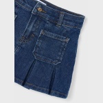 Dziewczęca spódnica wykonana z miękkiej, denimowej tkaniny o delikatnym efekcie sprania, który dodaje jej swobodnego, codziennego charakteru. W pasie znajduje się regulowana gumka, dzięki której spódnica idealnie dopasowuje się do sylwetki i zapewnia wygodę noszenia przez cały dzień. Model został ozdobiony subtelnymi zakładkami, nadającymi mu lekko rozkloszowany kształt, a praktyczne kieszenie z przodu podkreślają jego funkcjonalność i ułatwiają przechowywanie drobiazgów.