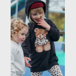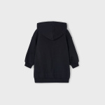 Czarna sukienka dla dziewczynki. Kołnierz z kapturem. Ciepła, gruba dzianina, zaprojektowana, by chronić przed zimnem. Ozdoby: nadruk sitodrukowy (print).