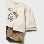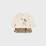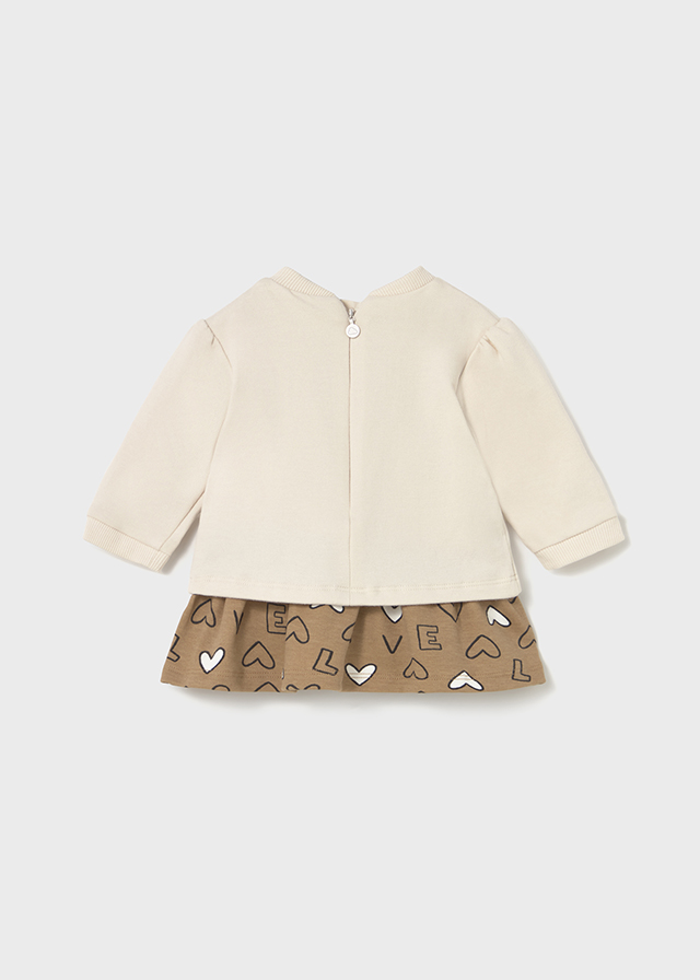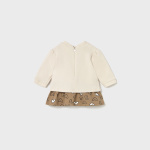 Sukienka dla dziewczynki o klasycznym, okrągłym dekolcie. Z tyłu znajduje się praktyczne zapięcie na suwak, które ułatwia przebieranie maluszka. Model zdobią dekoracyjne aplikacje, delikatne hafty oraz nadruk wykonany techniką sitodruku.