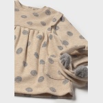 Sukienka dla noworodka. Okrągły dekolt. Zapięcie na zatrzaski na plecach. Model z marszczeniami. Z przodu kieszonki. Nadruk w groszki.