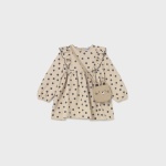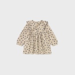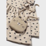 Sukienka z elastycznymi mankietami dla dziewczynki. Okrągły dekolt. Zapięcie na zatrzaski na plecach. Model z marszczeniami i falbankami. Nadruk w groszki.