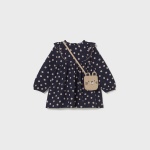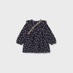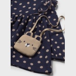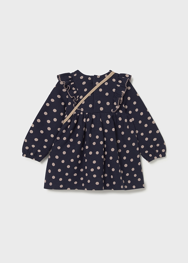 Sukienka z elastycznymi mankietami dla dziewczynki. Okrągły dekolt. Zapięcie na zatrzaski na plecach. Model z marszczeniami i falbankami. Nadruk w groszki.