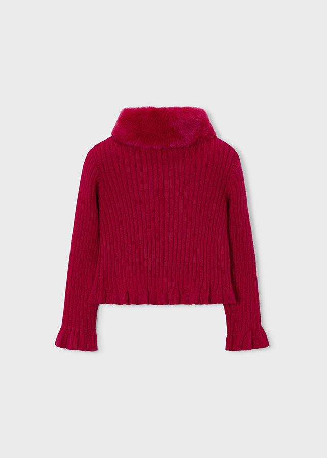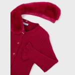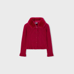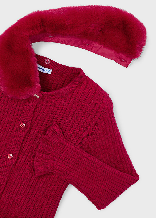 Dziewczęcy sweterek z futerkowym kołnierzem . Elegancki sweterek dla dziewczynki w czerwonym kolorze, zapinany z przodu na guziki. Model wyróżnia się miękkim, futerkowym kołnierzem, który dodaje stylu i przytulności. Wykonany z przyjemnego w dotyku materiału, idealnie sprawdzi się w chłodniejsze dni. Uniwersalny fason sprawia, że sweterek pasuje zarówno do codziennych stylizacji, jak i bardziej eleganckich okazji. Must-have w każdej dziecięcej szafie!