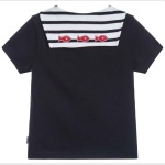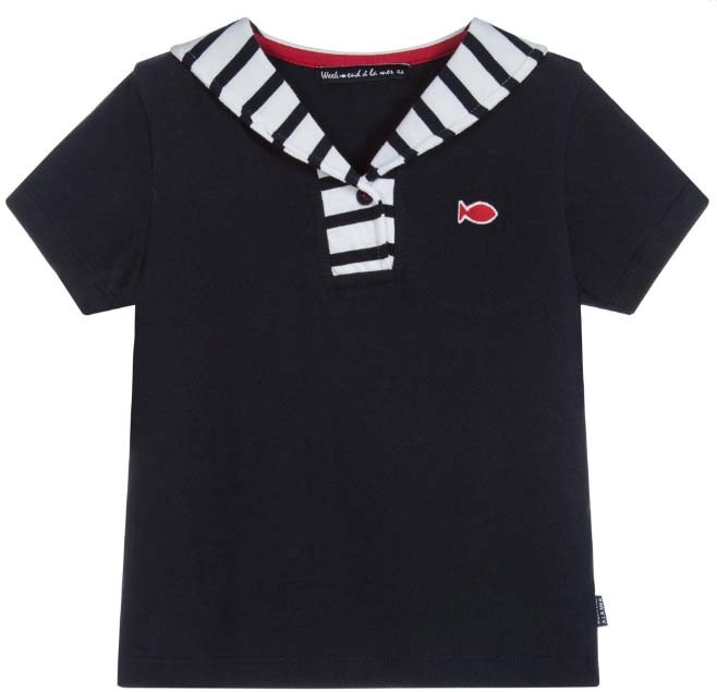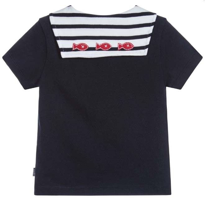 Letnia koszulka na krótki rękawek w biało-granatowe paseczki, z marynarskim kołnierzykiem ozdobionym czerwonymi naszywkami w kształcie rybek.