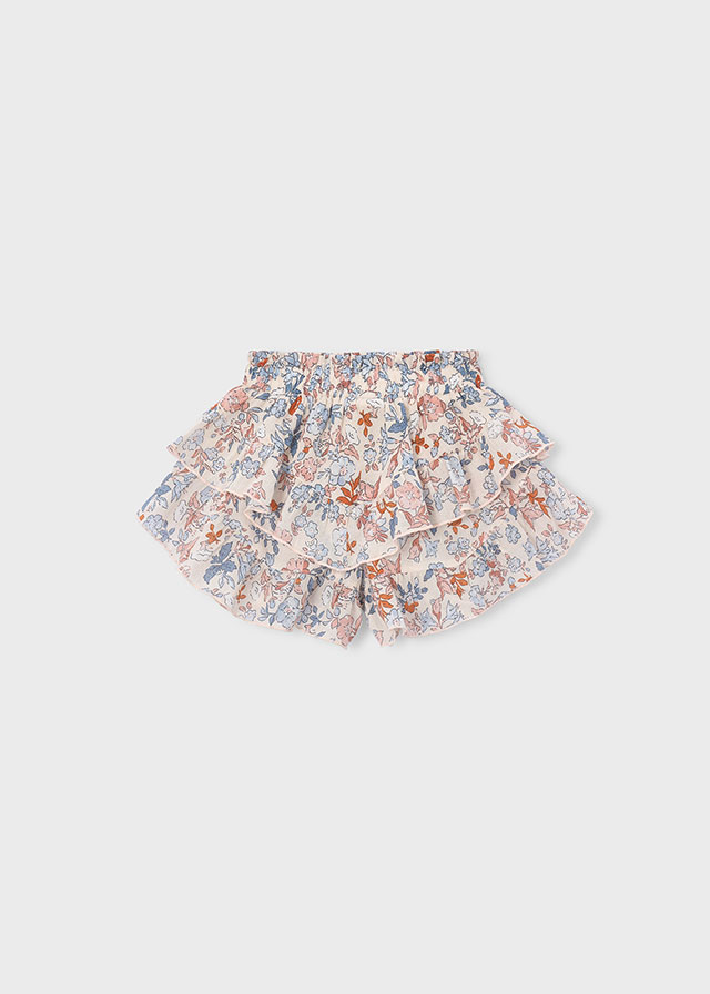Wzorzyste spódnico-spodnie z falbankami dla dziewczynki.
